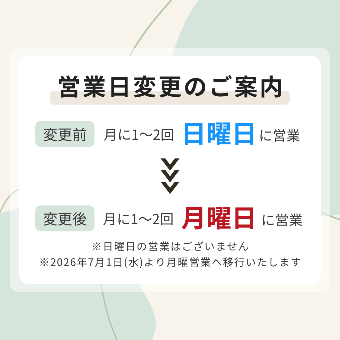 2026年(令和8年)7月より、サービス体制の見直しの一環として、営業日を変更することとなりました。 これまで当センターでは月に1~2回、日曜日に営業を行っておりましたが、2026年(令和8年)7月より該当する営業日を月 […]
