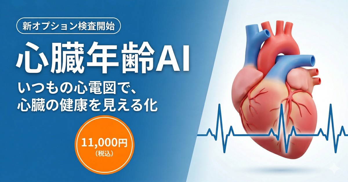 2026年4月1日より、新しいオプション検査「心臓年齢AI」を開始いたしました。 健康診断で毎年行われる心電図検査。その結果をAIで解析し、あなたの「心臓年齢」をレポートでお届けします。追加の検査は一切不要です。 心臓年 […]