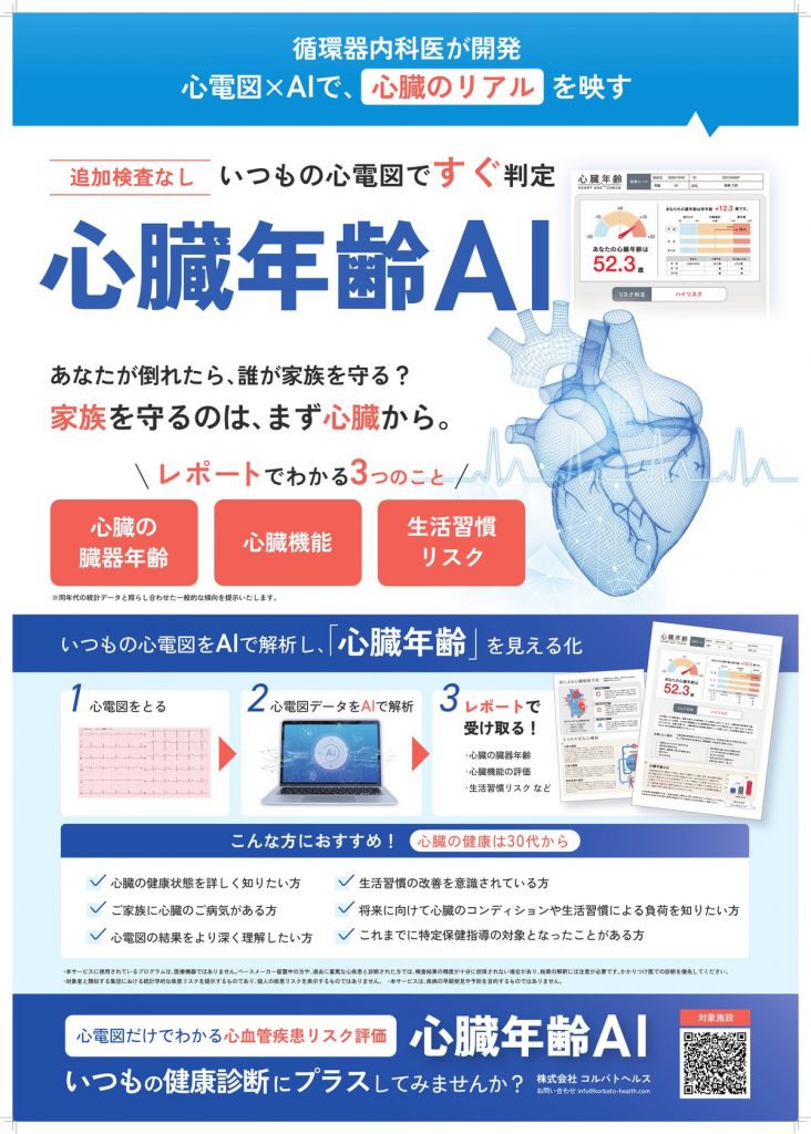 健康診断で毎年行われる心電図検査。その結果をAIで解析し、あなたの「心臓年齢」をレポートでお届けします。追加の検査は一切不要です。